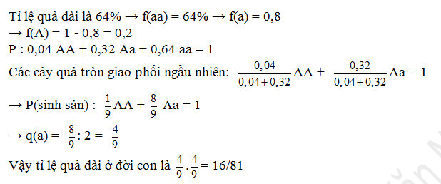 Ở một quần thể thực vật, gen D qui định quả tròn trội hoàn toàn so với gen d quả dài. Khi quần thể cân bằng di truyền thì cây quả dài chiếm tỷ lệ 64%. Cho các cây quả tròn giao phối ngẫu nhiên. Theo lí thuyết tỷ lệ quả dài ở đời con là