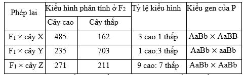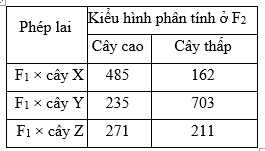 Ở một loài, khi cho một cây F1 lai với 3 cây X, Y, Z có kiểu gen khác nhau, thu được kết quả F2 phân tính như sau: