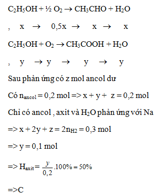 Oxi hóa 9,2 gam ancol etylic bằng CuO đun nóng, thu được 13,2 gam hỗn hợp gồm anđehit, axit, ancol chưa phản ứng và nước . Hỗn hơp này tác dụng với Na dư sinh ra 3,36 lít H2 ở đktc Phần trăm khối lượng ancol đã chuyển hóa thành axít là: