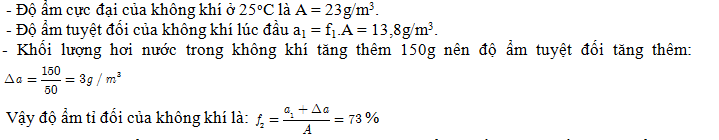 Phòng có thể tích 50m3 không khí, trong phòng có độ ẩm tỉ đối là 60%. Nếu trong phòng có 150g nước bay hơi thì độ ẩm tỉ đối của không khí là bao nhiêu? Cho biết nhiệt độ trong phòng là 25oC và khối lượng riêng của hơi nước bão hòa là 23g/m3.