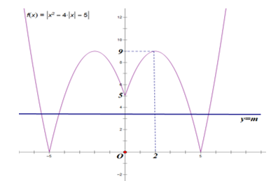 Dựa vào đồ thị thì đường thẳng \(y=\frac{117}{3}\) cắt đồ thị hàm số \(y=\left| {{x}^{2}}-4\left| x \right|-5 \right|\) tại hai điểm phân biệt nên