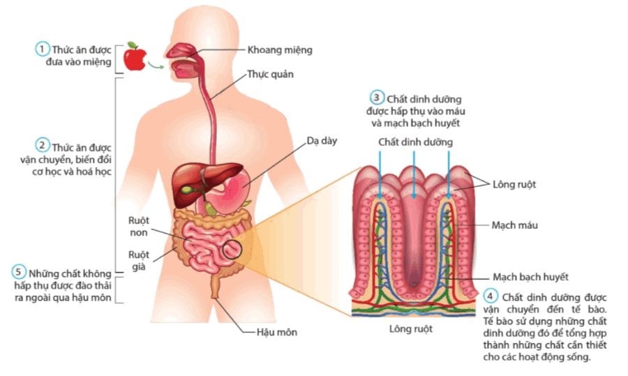 Quá trình dinh dưỡng gồm các giai đoạn: lấy thức ăn, tiêu hoá thức ăn, hấp thụ chất dinh dưỡng, đồng hoá các chất và thải chất cặn bã.