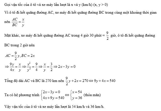Quãng đường từ A đến B dài 270 km. Tại cùng một thời điểm, một ô tô đi từ A đến B và một xe máy đi từ B đến A, hai xe gặp nhau tại C. Biết rằng khi di chuyển trên quãng đường AB, vận tốc của ô tô và vận tốc của xe máy không đồi. Từ C đến B ô tô đi hết 2 giờ, còn từ C đến A xe máy đi hết 4 giờ 30 phút. Tính vận tốc của ô tô và vận tốc của xe máy.
