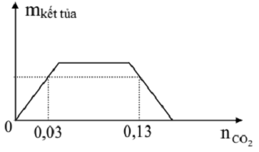 Sục khí CO2 vào V lít dung dịch hỗn hợp NaOH 0,2 M và Ba(OH)2 0,1M. Đồ thị biểu diễn khối lượng kết tủa theo số mol CO2 như sau: