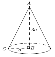 Khi quay tam giác \(ABC\) quanh cạnh \(AB\) ta nhận được một khối nón có chiều cao \(h = AB = 3a\), bán kính đáy \(r = BC = a\).