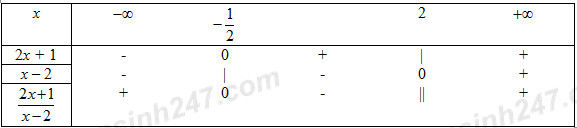 \( \Rightarrow {{2x + 1} \over {x - 2}} \ge 0 \Leftrightarrow \left[ \matrix{ x > 2 \hfill \cr x \le - {1 \over 2} \hfill \cr} \right.\)