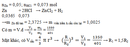 Thả một viên bi hình cầu bán kính là r1 làm bằng kim loại Zn nặng 3,375 gam vào 17,782 gam dung dịch HCl 15%. Khi khí ngừng thoát ra (phản ứng hoàn toàn) thì bán kính viên bi mới là r2 (giả sử viên bi bị mòn đều từ các phía). Nhận xét đúng là