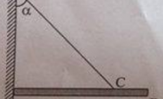 Thanh AB đồng chất, tiết diện đều có khối lượng m1. Thanh được treo bằng sợi dây nhẹ CD, đầu A của thanh tựa trên một bức tường thẳng đứng, AB vuông góc với tường (Hình 2). Biết AC = 3BC, góc \(\alpha ={{45}^{0}}\).