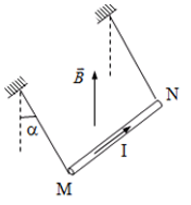 Thanh dây dẫn thẳng MN có chiều dài \\(l~=20cm\\), khốí lượng \\(m=10g\\), được treo trên hai sợi dây mảnh sao cho MN nằm ngang. Cả hệ thống được đặt trong từ trường đều có cảm ứng từ \\(B=0,25T\\) và vectơ \\(\\overrightarrow{B}\\) hướng lên trên theo phương thẳng đứng. Nếu cho dòng điện \\(I=2\\sqrt{3}A\\) chạy qua, người ta thấy thanh MN được nâng lên vị trí cân bằng mới và hai sợi dây treo bây giờ lệch một góc \\(\\alpha \\) so với phương thẳng đứng. Cho \\(g=10m/{{s}^{2}}\\), góc lệch \\(\\alpha \\) là: