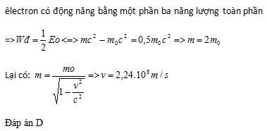 Theo thuyết tương đối, một electron có động năng bằng một phần ba năng lượng toàn phần của nó thì electron này chuyển động với tốc độ bằng