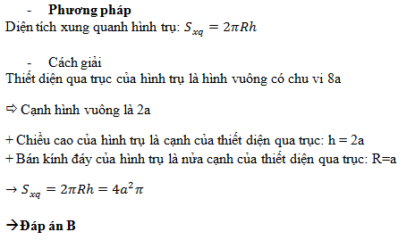 Thiết diện qua trục của một hình trụ là hình vuông có chu vi là 8a. Diện tích xung quanh của hình trụ đó là: