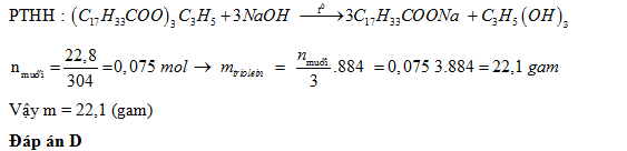 Thủy phân hoàn toàn m gam triolein trong dung dịch NaOH dư, đun nóng. Sau phản ứng hoàn toàn thu được 22,8 gam muối (xà phòng). Giá trị của m là: