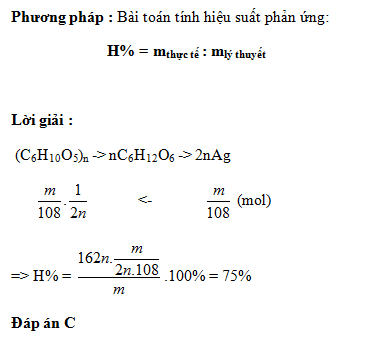 Thủy phân m gam tinh bột trong môi trường axit (giả sử sự thủy phân chỉ tạo glucozo). Sau phản ứng, đem trung hòa axit bằng kiềm rồi thực hiện phản ứng tráng bạc thu được m gam Ag. Hiệu suất của phản ứng thủy phân tinh bột là: