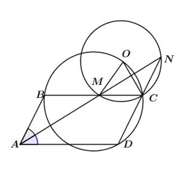 Tia phân giác góc \(\widehat {BAD}\) của hình bình hành ABCD cắt các đường thẳng BC và DC lần lượt tại hai điểm N và M Dựng ra phía ngoài hình bình hành ABCD tam giác cân MCO với \(\widehat {MOC} = \widehat {BAD}\) . Khi đó: