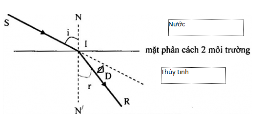 Tia sáng đi từ nước có chiết suất n1 =4/3 sang thủy tinh có chiết suất n2 = 1,5. Góc khúc xạ và góc lệch D tạo bởi tia khúc xạ và tia tới có giá trị là? Biết góc tới i = 300.