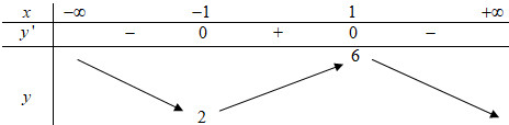 \(y' = 0 \Leftrightarrow - 3{x^2} + 3 = 0 \Leftrightarrow x = \pm 1\)