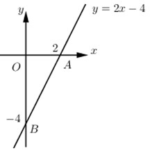 Do đó đồ thị \(y = 2x - 4\) cắt trục Ox tại \(A\left( {2;0} \right)\) và cắt trục Oy điểm \(B\left( {0; - 4} \right)\).