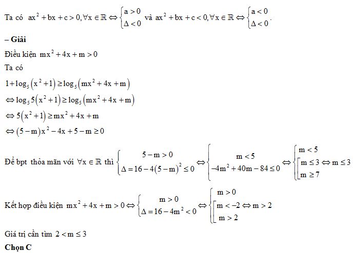Tìm m để bất phương trình \(1 + {\log _5}\left( {{x^2} + 1} \right) \ge {\log _5}\left( {m{x^2} + 4x + m} \right)\) thoã mãn với mọi \(x \in R\) .