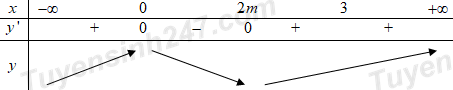 Cho \(y' = 0 \Leftrightarrow 3{x^2} - 6mx = 0 \Leftrightarrow 3x\left( {x - 2m} \right) = 0 \Leftrightarrow \left[ \begin{array}{l}x = 0\\x = 2m\end{array} \right..\)