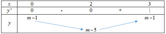 Để giá trị nhỏ nhất của hàm số \(y = {x^3} - 3{x^2} + m - 1\) trên đoạn \(\left[ {0;3} \right]\) bằng 2 thì \(m - 5 = 2 \Leftrightarrow m = 7\).