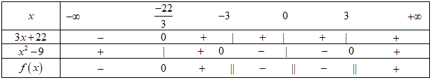 \( \Rightarrow f\left( x \right) = \frac{{x + 4}}{{{x^2} - 9}} - \frac{2}{{x + 3}} - \frac{{4x}}{{3x - {x^2}}}\) nhận giá trị âm khi \(x \in \left( { - \infty ;\frac{{ - 22}}{3}} \right) \cup \left( { - 3;0} \right) \cup \left( {0;3} \right)\)