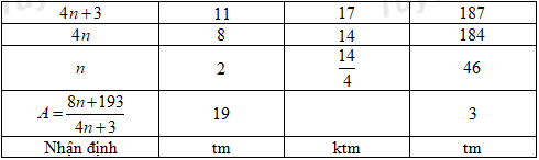 Vì \(n \in \mathbb{N} \Rightarrow 4n + 3 \in \left\{ {11;\,\,17;\,\,187} \right\}.\) Ta có bảng sau: