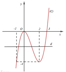 Số nghiệm của phương trình (*) bằng số giao điểm của đồ thị hàm số \(y={{x}^{3}}-3{{x}^{2}}\,\,(C)\) và đường thẳng\(y={{m}^{3}}-3{{m}^{2}}\,\,\,(d)\).