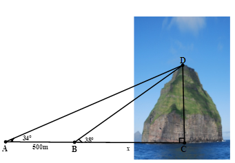Tính chiều cao của một ngọn núi (làm tròn đến mét), biết tại hai điểm A, B cách nhau 500m, người ta nhìn thấy đỉnh núi với góc nâng lần lượt là 340 và 380. (Hình minh họa như hình bên)