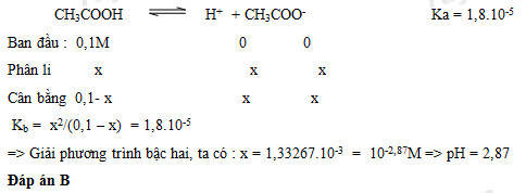 Tính pH của dung dịch CH3COOH 0,1M biết Ka = 1,8.10-5 ?