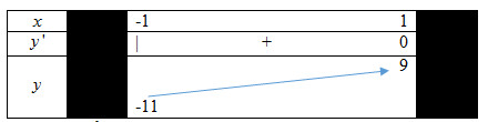 \( \Rightarrow \mathop {Max}\limits_{\left[ {1;1} \right]} f(t) = 9,\,\,\mathop {Min}\limits_{\left[ {1;1} \right]} f(t) =  - 11 \Rightarrow \)Tổng của GTLN và GTNN của hàm số \(y = {\cos ^3}x + 9\cos x + 6{\sin ^2}x - 1\) là -2.