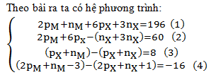 Tổng số hạt proton, nơtron, electron tỏng phân tử MX3 là 196, trong đó số hạt mang điện nhiều hơn số hạt không mang điện là 60. Khối lượng nguyên tử của X lớn hơn của M là 8. Tổng số hạt (p, n, e) trong X- nhiều hơn trong M3+ là 16. Vậy M và X lần lượt là