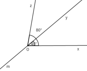 \(\Rightarrow \widehat{xOy}+\widehat{yOz}=\widehat{xOz}\Rightarrow \widehat{yOz}=\widehat{xOz}-\widehat{xOy}\Rightarrow \widehat{yOz}={{80}^{0}}-{{40}^{0}}={{40}^{0}}\) .