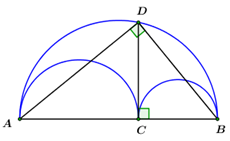 Trên hình vẽ là ba nửa đường tròn đường kính \(AB,\,\,AC,\,\,CB.\) Biết \(DC \bot AB = \left\{ C \right\},\) khi đó tỉ số diện tích hình giới hạn bởi ba nửa đường tròn nói trên và diện tích hình tròn bán kính \(DC\) là: