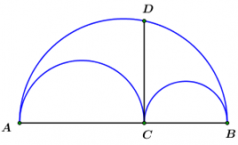Trên hình vẽ là ba nửa đường tròn đường kính \(AB,\,\,AC,\,\,CB.\) Biết \(DC \bot AB = \left\{ C \right\},\) khi đó tỉ số diện tích hình giới hạn bởi ba nửa đường tròn nói trên và diện tích hình tròn bán kính \(DC\) là: