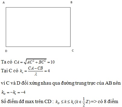 Trên mặt nước có hai nguồn kết hợp cùng phương , cùng pha A và B cách nhau 8 cm. Biết bước sóng lan truyền là 1 cm. Gọi C và D là hai điểm trên mặt nước sao cho ABCD là hình chữ nhật có cạnh BC bằng 6 cm. Tính số điểm dao động với biên độ cực tiểu trên đoạn CD ?