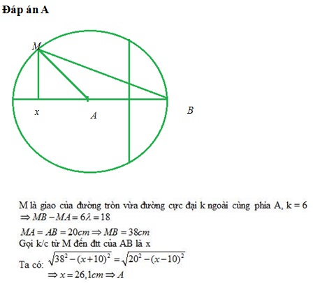 Trên mặt nước, hai nguồn kết hợp A, B cách nhau 20cm dao động điều hòa cùng pha, tạo ra sóng có bước sóng 3cm. Xét các điểm trên mặt nước thuộc đường tròn tâm A, bán kính AB, điểm nằm trên đường tròn dao động với biên độ cực đại cách xa đường trung trực của AB nhất một khoảng là: