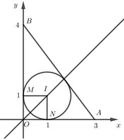 Gọi \(I\left( {m;m} \right)\,\,\left( {m < 3} \right)\) là tâm đường tròn nội tiếp ta có: