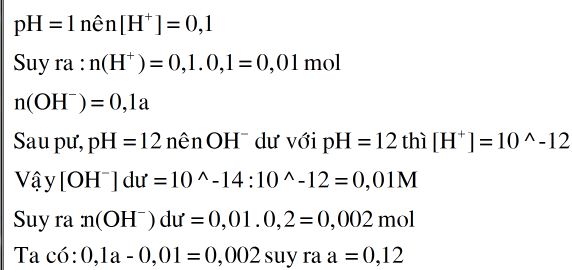 Trộn 100 ml dung dịch có pH = 1 gồm HCl và HNO3 với 100 ml dung dịch NaOH nồng độ a (mol/l) thu được 200 ml dung dịch có pH = 12. Giá trị của a là