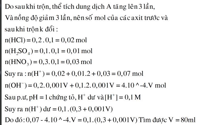 Trộn 3 dung dịch H2SO4 0,1M; HCl 0,2M; HNO3 0,3M với thể tích bằng nhau được dung dịch A. Cho 300 ml dung dịch A tác dụng với V ml dung dịch B chứa NaOH 0,2M và Ba(OH)2 0,1M được dung dịch C có pH =1. Giá trị của V là