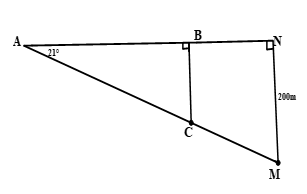 \(\sin NAM=\frac{MN}{AM}\Leftrightarrow AM=\frac{MN}{\sin NAM}=\frac{200}{\sin {{21}^{0}}}=558m=0,558km\)