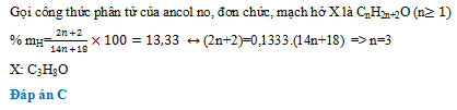 Trong công thức ancol no, đơn chức mạch hở X có phần trăm khối lượng hidro bằng 13,33%. Công thức phân tử của X là