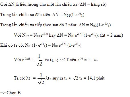 Trong điều trị ung thư, bệnh nhân được chiếu xạ với một liều xác định nào đó từ một nguồn phóng xạ. Biết nguồn có chu kì bán rã là 4 năm. Khi nguồn được sử dụng lần đầu thì thời gian cho một liều chiếu xạ là 10 phút. Hai năm sau đó, thì thời gian cho một liều chiếu xạ là