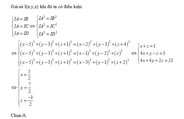 Trong không gian cho 4 điểm A(5;3;-1) B(2;3;-4) C(1;2;0) D(3;1;-2) không đồng phẳng. Tìm toạ độ điểm I cách đều bốn đỉnh A; B;C;D.