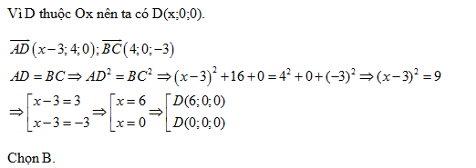 Trong không gian Oxyz cho các điểm A(3;-4;0) B(0;2;4) C(4;2;1). Tìm tọa độ điểm D trên trục Ox sao cho AD=BC.