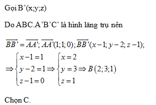 Trong không gian Oxyz cho hình lăng trụ tam giác ABC.A’B’C’ có A(1;1;1) B(1;2;1) C(1;1;2) A’(2;2;1). Tìm tọa độ đỉnh B’.