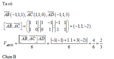 Trong không gian Oxyz cho tứ diện ABCD có A(1;0;0) B(0;1;1) C(2;1;0) D(0;1;3). Thể tích khối tứ diện ABCD bằng:
