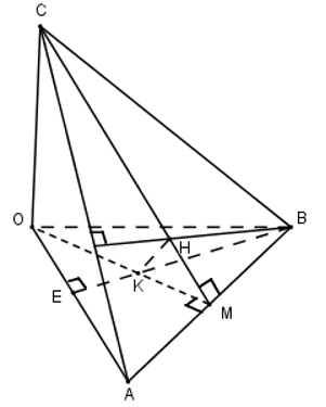 Gọi K là trực tâm của tam giác OAB ta có : \(\left\{ \begin{align} & BK\bot OA \\ & BK\bot OC \\ \end{align} \right.\Rightarrow BK\bot \left( OAC \right)\Rightarrow BK\bot AC\) \(\left\{ \begin{align} & AC\bot BK \\ & AC\bot BH \\ \end{align} \right.\Rightarrow AC\bot \left( BHK \right)\Rightarrow AC\bot HK\,\,\,\left( 1 \right)\)