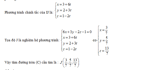 Đường thẳng IJ qua I(3;2;1) và vuông góc (P) nên nhận =( 6;3;-2) làm vectơ chỉ phương