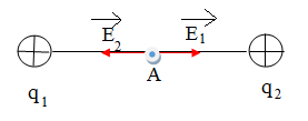 \(\overrightarrow {{E_1}} \uparrow \downarrow \overrightarrow {{E_2}} \Rightarrow E = \left| {{E_1} - {E_2}} \right| = \left| {k.\frac{{{q_1}}}{{{r^2}}} - k.\frac{{{q_2}}}{{{r^2}}}} \right| = 0\)