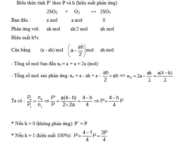 Trong một bình kín dung tích không đổi chứa a mol SO2 , a mol O2 và một ít bột xúc tác V2O5; áp suất và nhiệt độ trong bình là P atm và t0C. Nung nóng bình một thời gian, sau đó đưa nhiệt độ bình về t0C, áp suất trong bình lúc này là P’. Lập biểu thức P theo P và h (hiệu suất phản ứng). Hỏi P’ có giá trị trong khoảng nào, biết rằng ở t0C các chất đều ở thể khí.